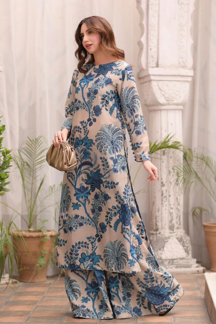 Style: Long Shirt with buttons on the side seam & sleeves, front boat neck & back neck with strap closure details paired with Flared Palazzos