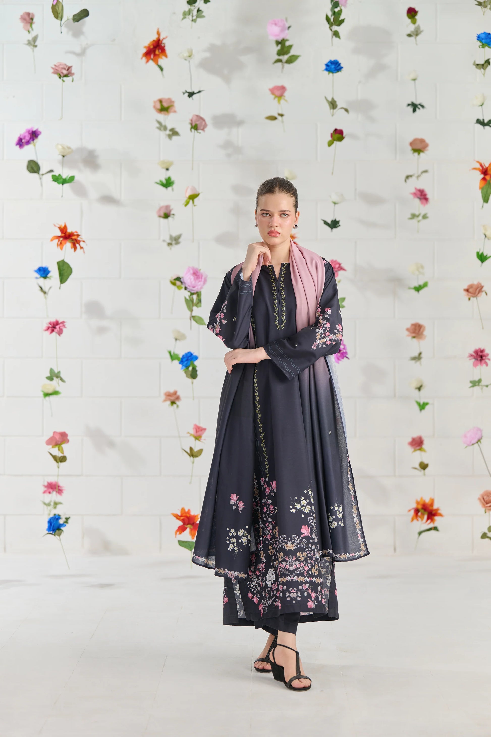 Color: A black base elegantly contrasts with a delicate tea pink and off-white floral design, creating a striking and sophisticated look.